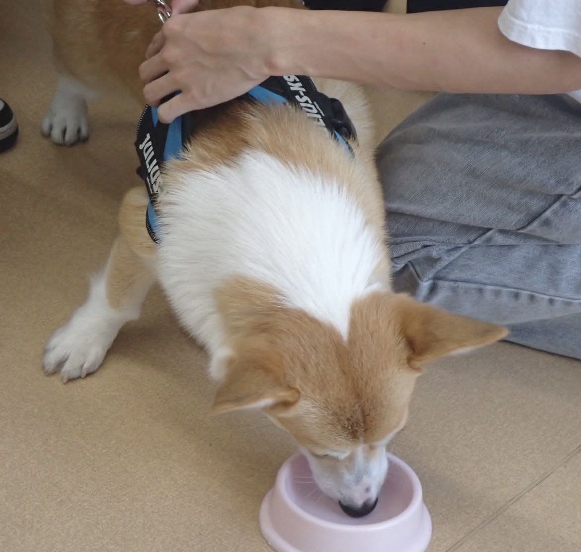 これから毎日行うことになるリードの着脱ですが、お互いに格闘しないように、ご褒美に夢中になっている間に行いましょう!