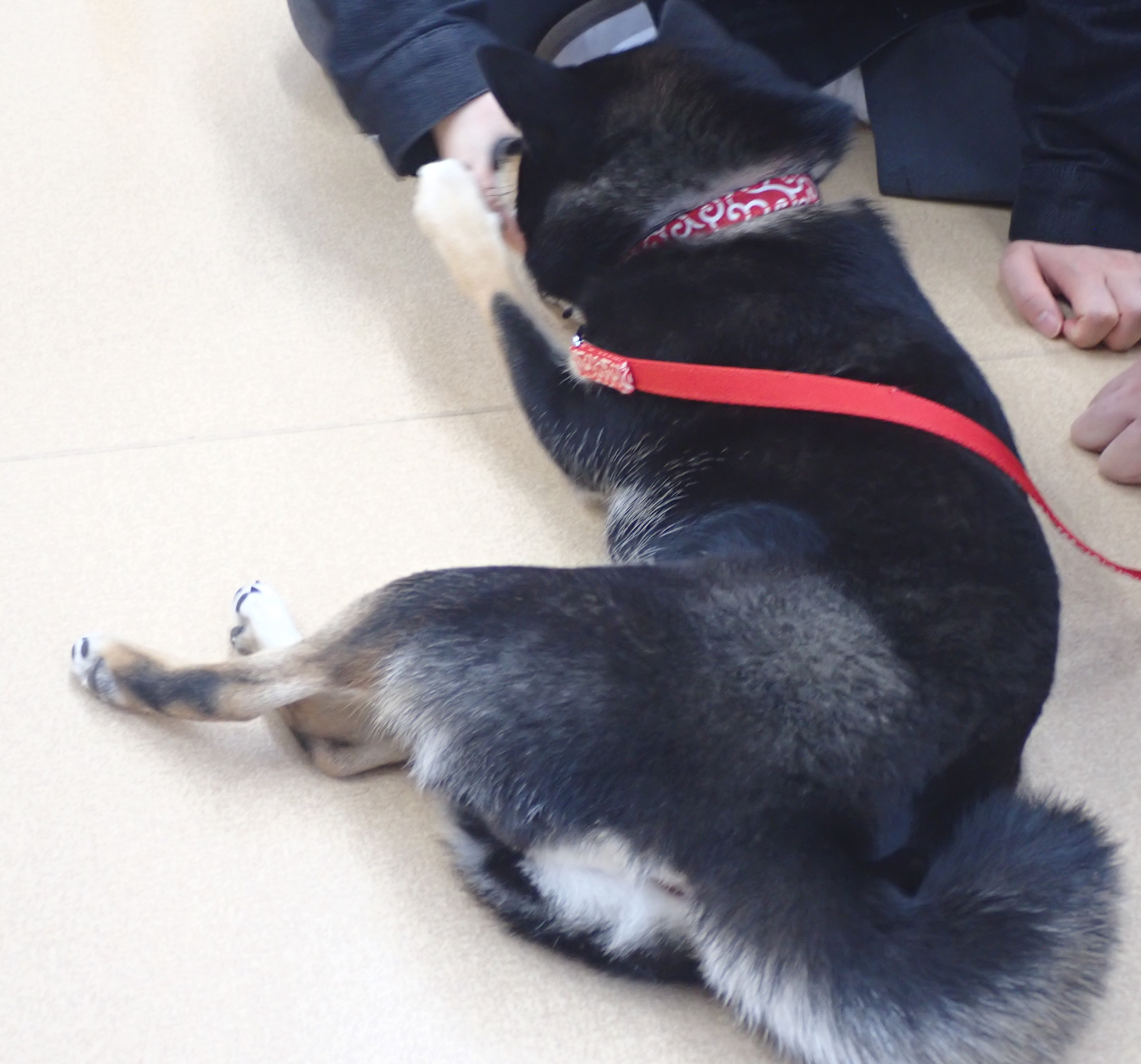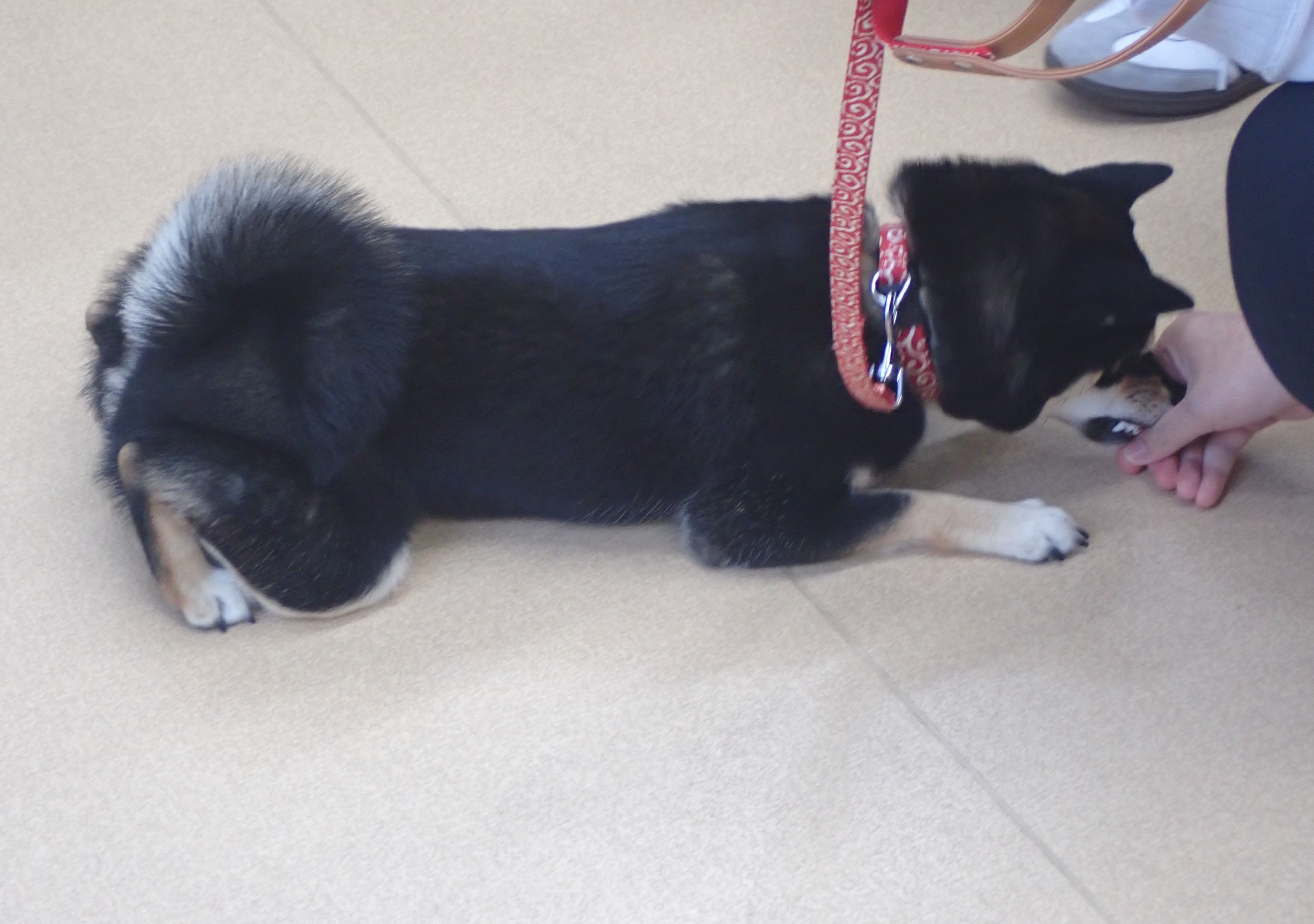 おすわりの体勢から、前足の間にご褒美を持ってきて誘導し、体を床につけることで伏せになります⭐