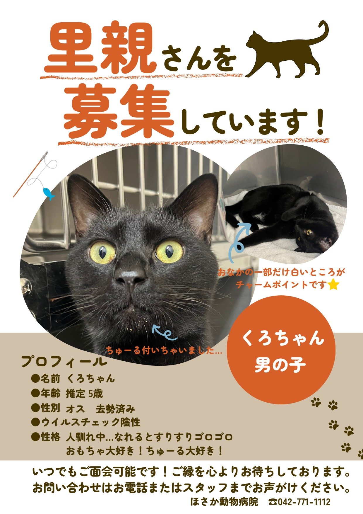 保護ねこ(くろちゃん)の里親さんを募集しています。 ご面会も可能です。 ご興味がある方がいらっしゃいましたら、お気軽に当院までご連絡ください。