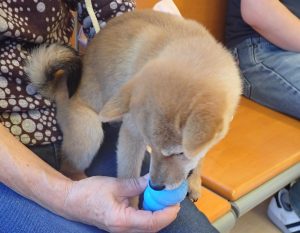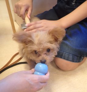豆柴の「まめちゃん」はスペシャルコングを持参してくれたのでコングをあげながら体を触る練習をしました♪