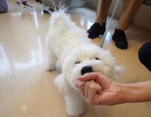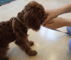 最初に「ハンドコング」といって手におやつを握りグーの状態でおやつを食べれるか確認です♪