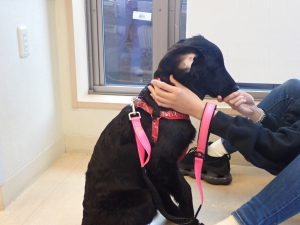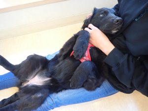 まずは落ち着かせる練習から!ルージュちゃんとてもリラックスしていて上手です!