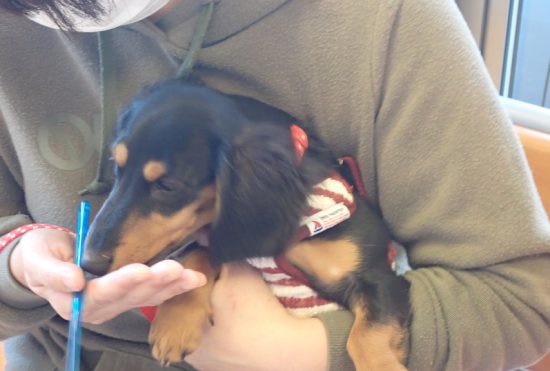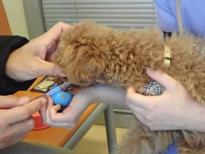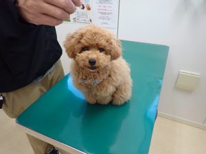 ぷにちゃんは診察台にて飼い主さんの号令でオスワリして待つことができました👏