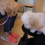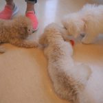 左から ムアちゃん(トイプー)先輩ワンコの、みみちゃん(ダップー) チルちゃん(ビションフリーゼ) 参加者の方から「色違い三姉妹」と命名されました♪ みみちゃんのお気に入りおもちゃにみんな興味津々・・・の図です。
