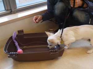 ちくわちゃんは慣れないクレートに少し怖がりながらもとっても頑張ってくれていました。 数分の間で前足を入れられるようにまで成長していました☆彡