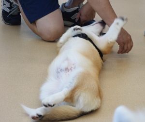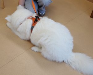 次にふせの練習、、、前足の間にご褒美を持ってきて誘導し、体を床につけてもらいます