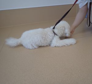 次にふせの練習、、、前足の間にご褒美を持ってきて誘導し、体を床につけてもらいます