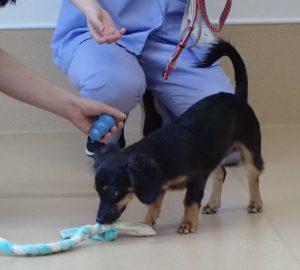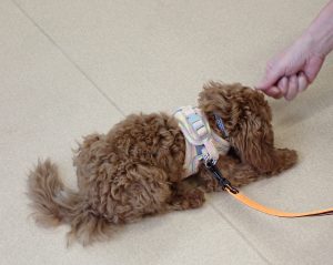 そして、ふせはお座りの状態で前足の間におやつで誘導して床にお腹を付けてもらいます