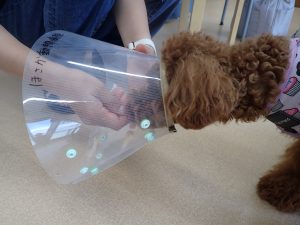 やり方は先ほどのバンダナと同じですが、今回はエリザベスカラーを使って行います。