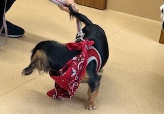 バンダナの穴の先におやつを持った手を出し、おやつを動かしてくぐってもらいます。