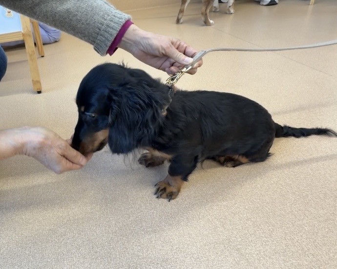 誘導で足元に来てもらい、来てくれたら、首輪を軽く握ってご褒美です🎵