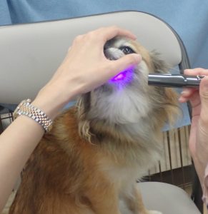 外来中に獣医師による歯科検診を行い、どこの歯に汚れがあるか、歯周病のレベルはどのくらいかチェック!