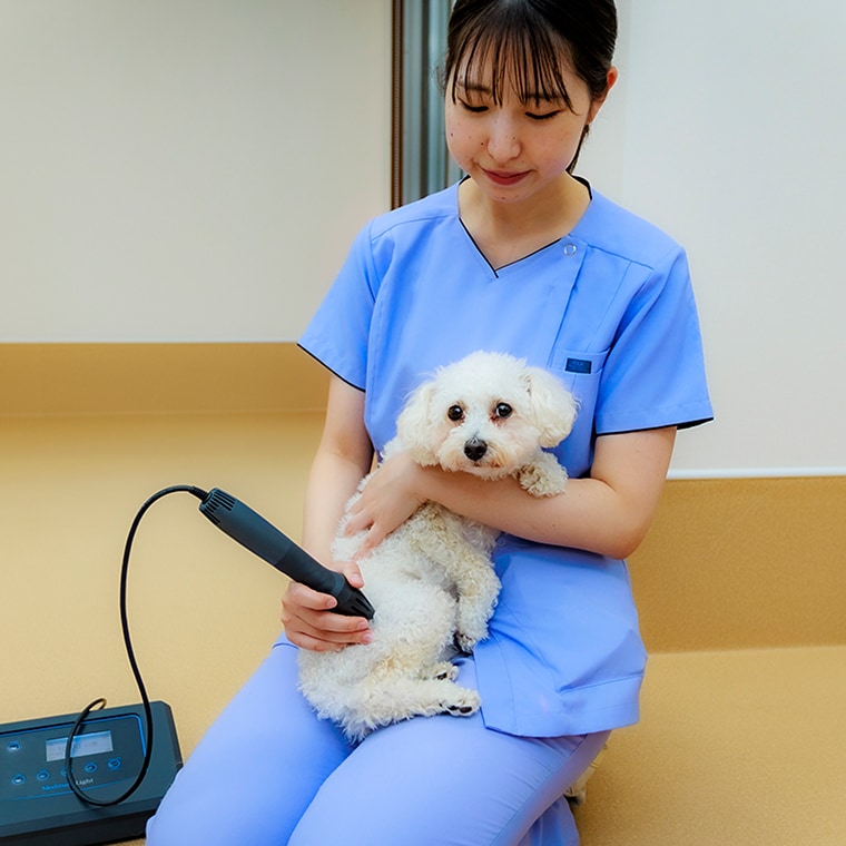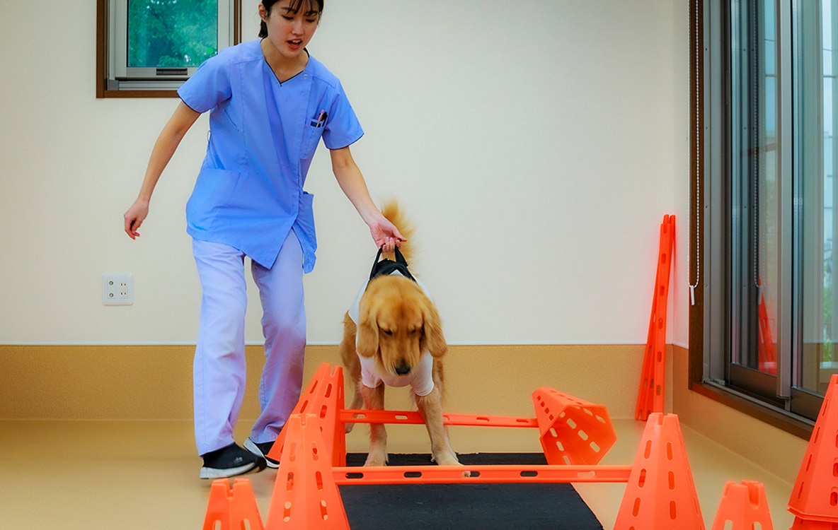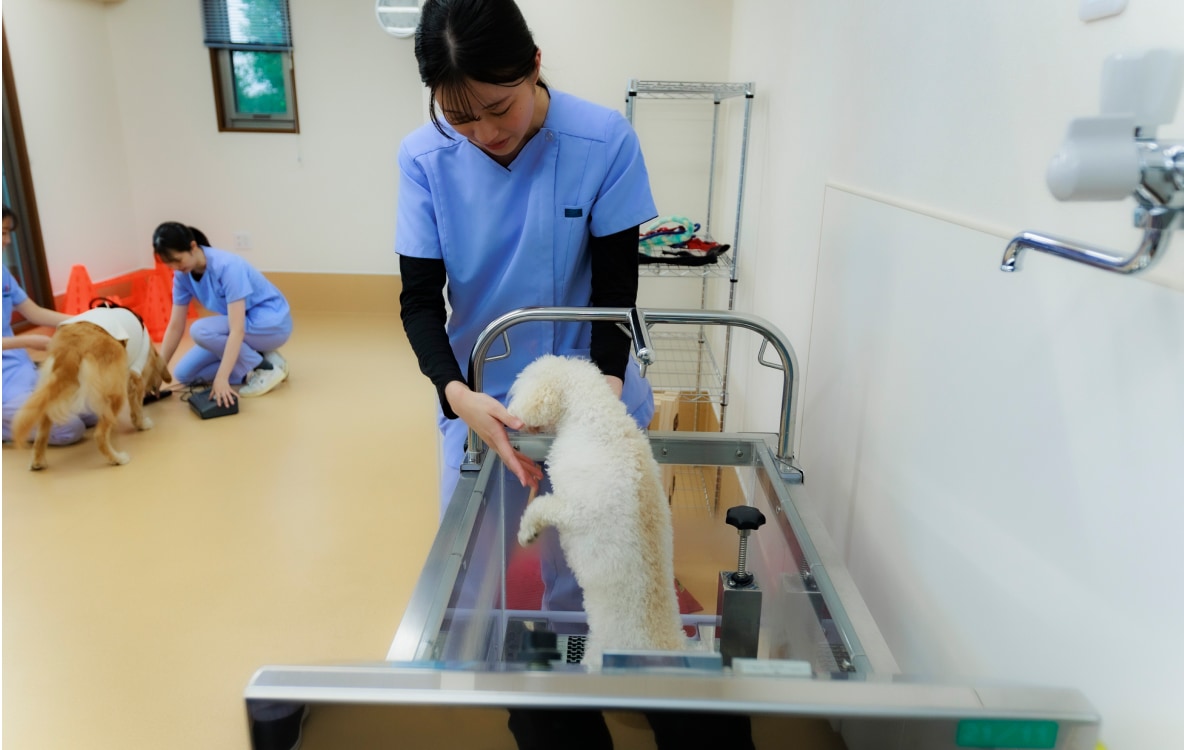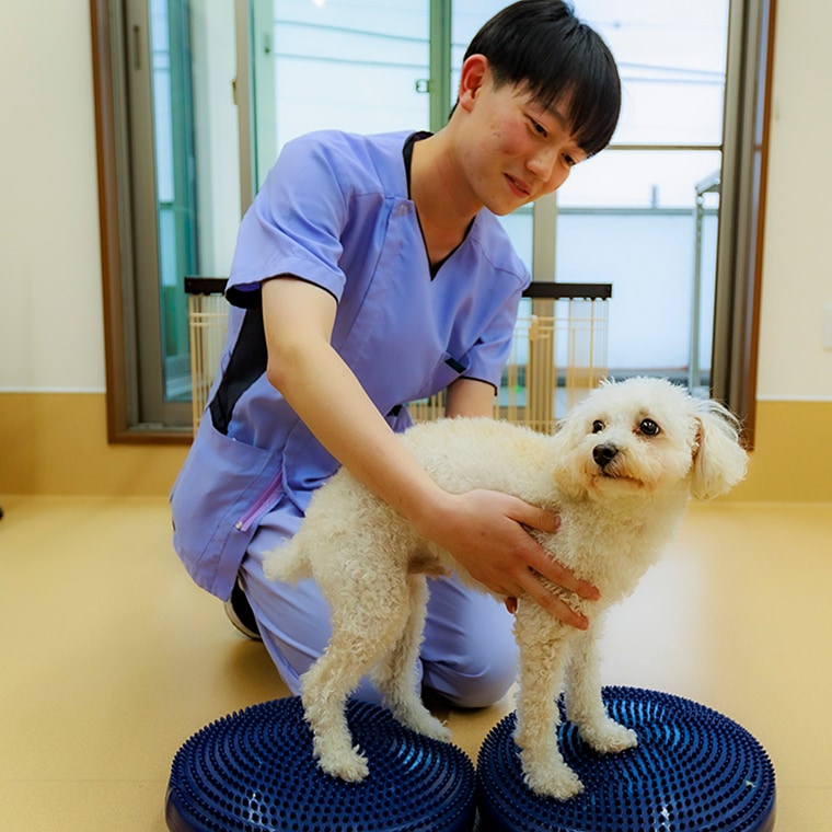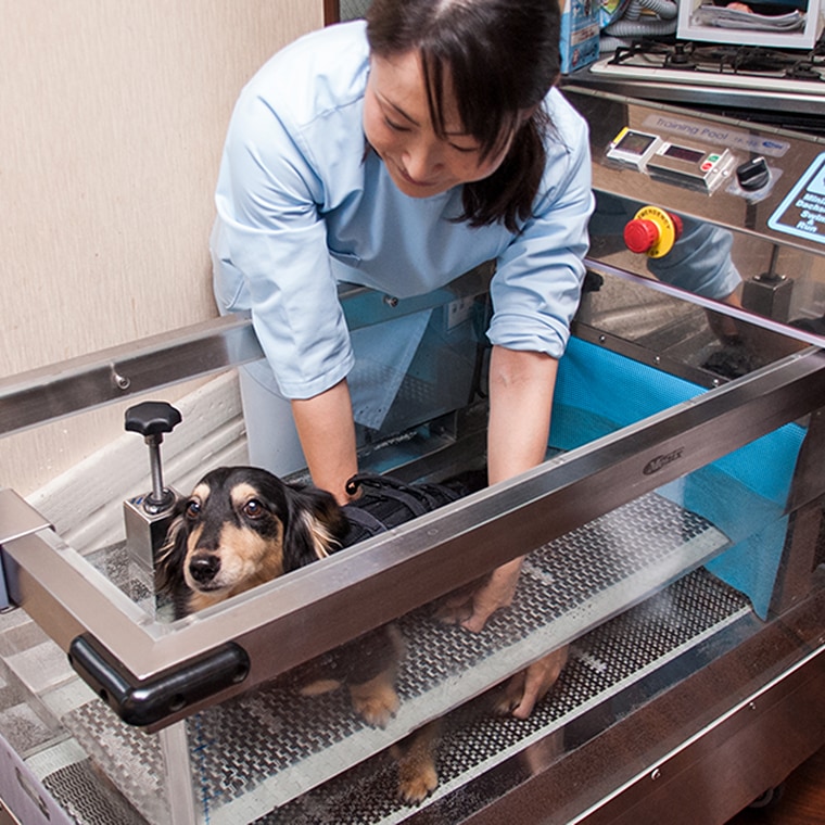 獣医師が1頭1頭の状態に合わせたリハビリテーションプログラムを設定し、愛玩動物看護師・看護助手が日々の状態に適切なリハビリテーションを行います。